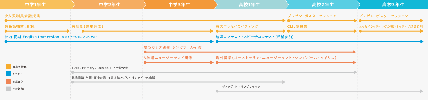 - 中学3年から高校2年までオーストラリア、ニュージーランド、シンガポール、イギリスの5校と1教育区へ3〜17週間留学できる制度があります。また、高校1・2年は留学斡旋機関を通した1年間の長期留学で単位認定される制度も整備されています。毎年、姉妹校からは留学生が来日し、本校生と共に学校生活を送り、交流を深めます。