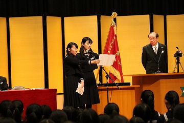 記念品贈呈。卒業生より、体育大会で使用する各団の団旗が贈られました。
