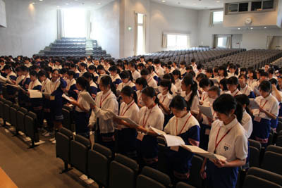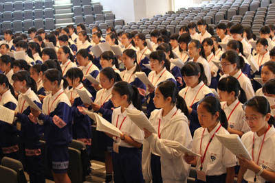 次は講堂での音楽です。こちらは昨日コーラス部の先輩の皆さんが歌っているのを鑑賞した第二校歌の練習でした。入学式で歌うのですが少しずつ慣れてきたでしょうか。