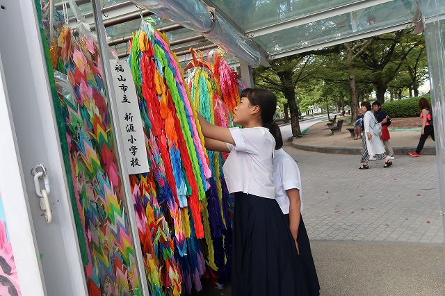 平和委員の司会で黙とう・千羽鶴奉納・誓いの言葉・「青い空は」合唱