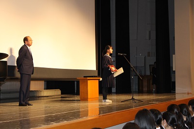 本日の講堂朝礼は、アーチェリー競技でユースオリンピックに出場した生徒の特別表彰と、