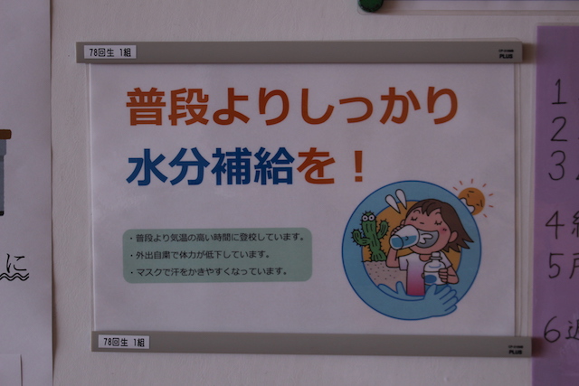 各教室には感染防止のための注意事項や水分補給に関する張り紙が。この他にも、担任の先生より朝礼時に様々な注意事項がありました。