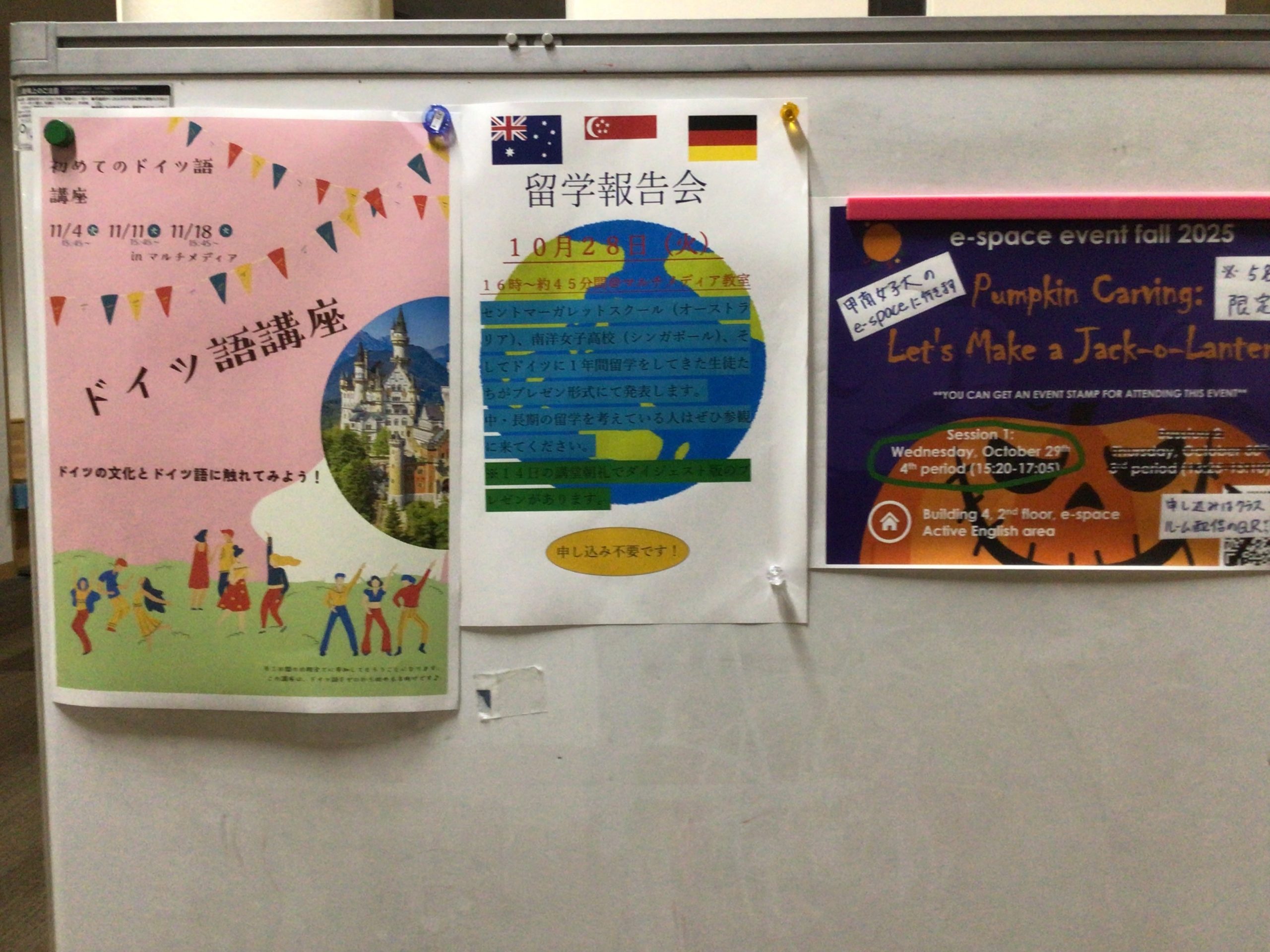 今月末から国際教育イベントが多数予定されており、案内と募集が始まっております。留学報告会はこの夏にオーストラリアとシンガポールに交換留学で派遣された生徒たちと昨年1年間ドイツ留学をした生徒がプレゼン形式で発表します。また、そのドイツ留学をした生徒が講師となって初心者向けのドイツ語講座を開催します。これらの本校生だけでなく保護者も参加することができます。あと、10月といえばHalloween! 今月末には甲南女子大学のe-space主催のpumpkin carvingにも希望者が参加します。出来上がったJack-o-lanternは後日紹介します。