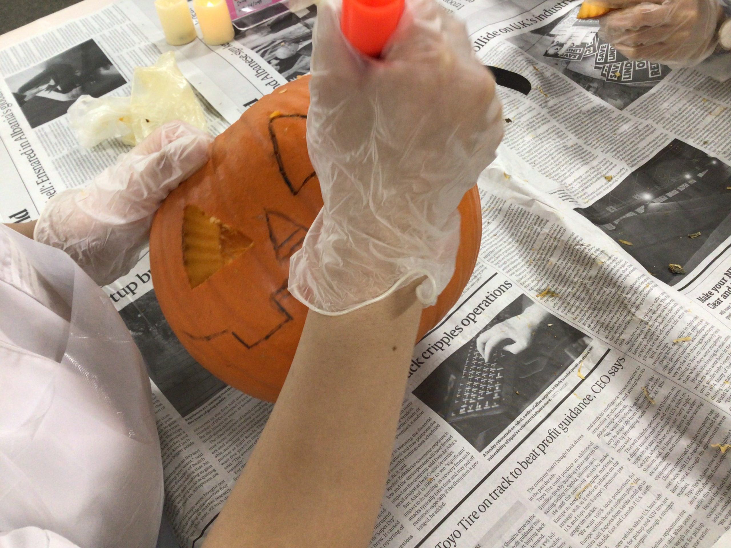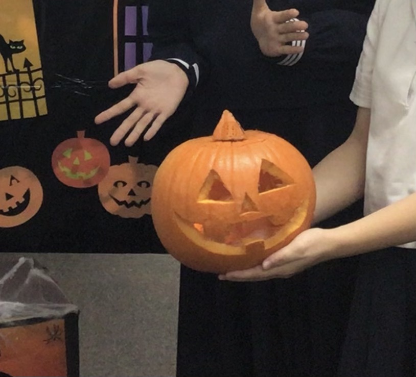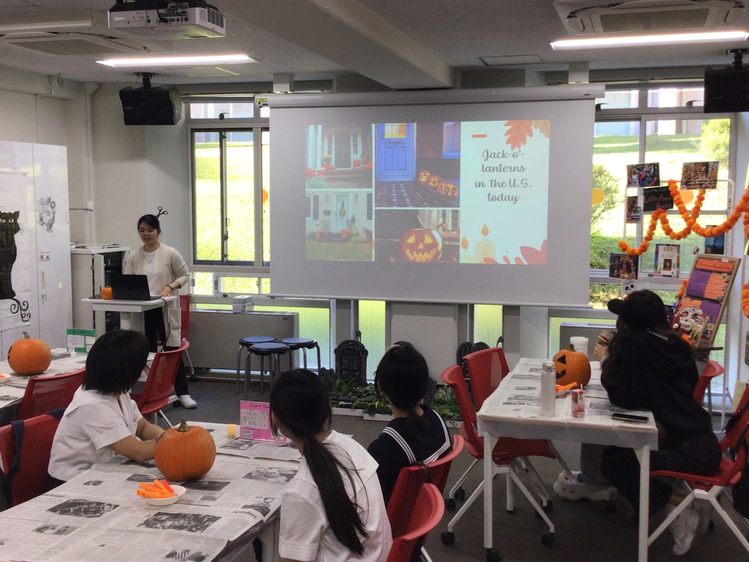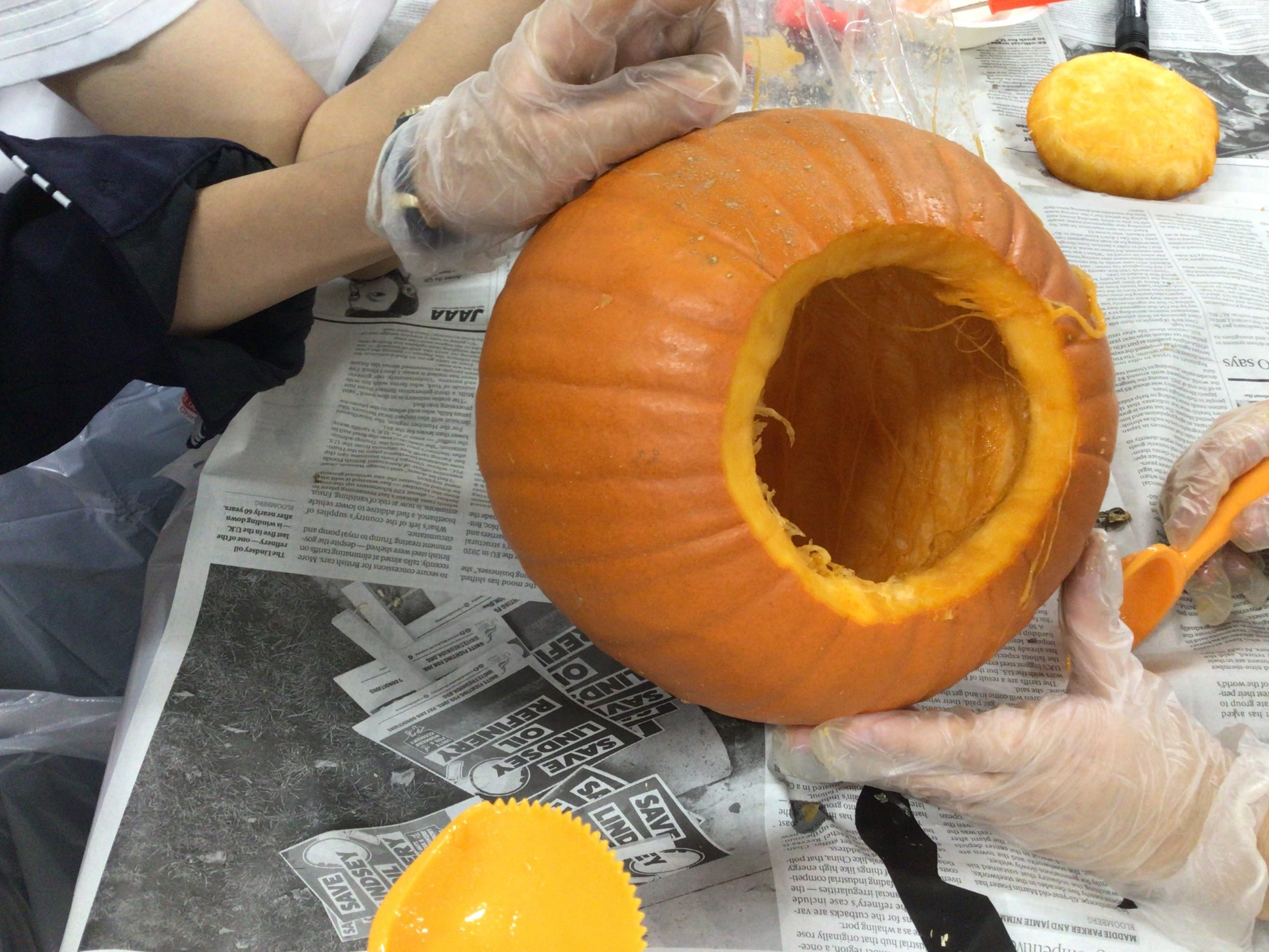 本日は甲南女子大学e-spaceでのイベント”Pumpkin Carving”に高校生が参加しました。近年、日本でもすっかり定着した感のあるハロウィンのかぼちゃランタン”Jack-o-lantern”の製作です。最初はe-spaceのAgnes先生からハロウィンに関するクイズがあり、その後製作を始めると1時間ほどで完成しました。