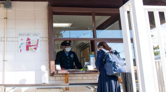 正門には守衛が常駐。来校者のチェックも徹底することで、日々生徒を見守り安心した学校生活を実現します。